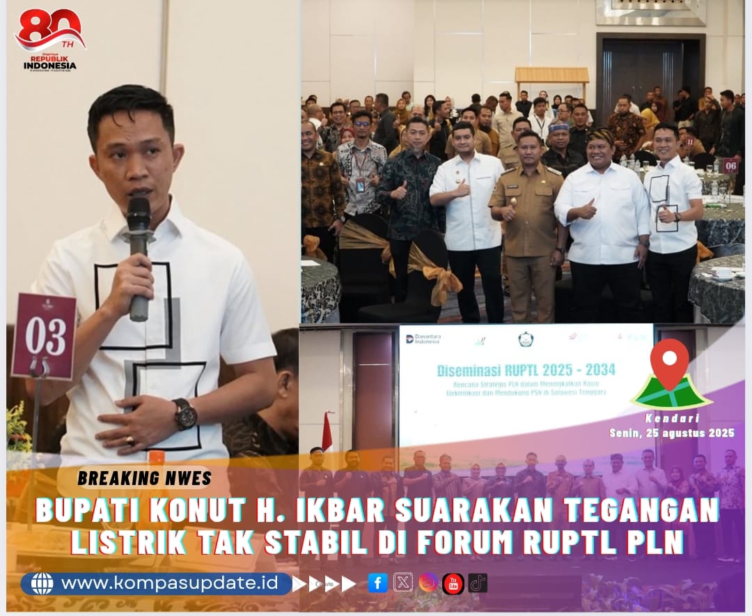 Kompasupdate.id – Bupati Konawe Utara, H. Ikbar, SH., MH, menyuarakan langsung keluhan masyarakat terkait ketidakstabilan tegangan listrik di wilayahnya dalam kegiatan Diseminasi Rencana Usaha Penyediaan Tenaga Listrik (RUPTL) 2025–2034 yang digelar oleh PT PLN (Persero) di Hotel Claro Kendari, Senin (25/8).