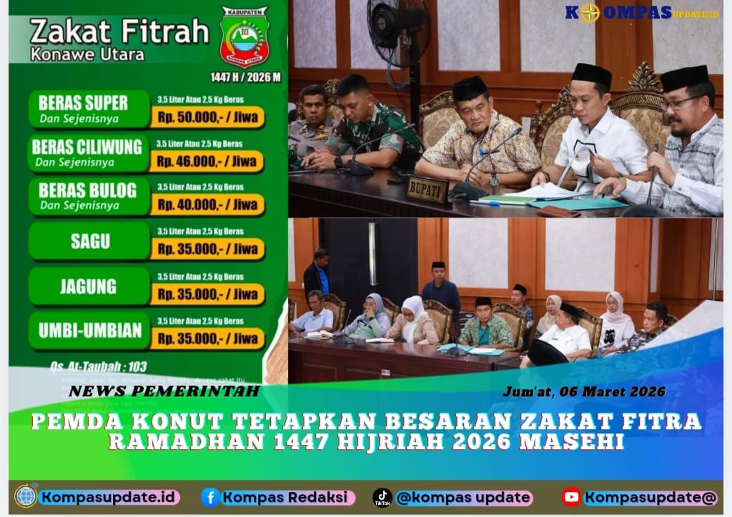 Kompasupdate.id – Pemerintah Daerah Kabupaten Konawe Utara secara resmi menetapkan besaran Zakat Fitrah untuk tahun 1447 Hijriah/2026 Masehi. Penetapan tersebut dilakukan melalui rapat bersama yang melibatkan Pemerintah Daerah, Kementerian Agama, Majelis Ulama Indonesia (MUI), serta unsur Forkopimda yang berlangsung di Aula Lantai II Kantor Bupati Konawe Utara.